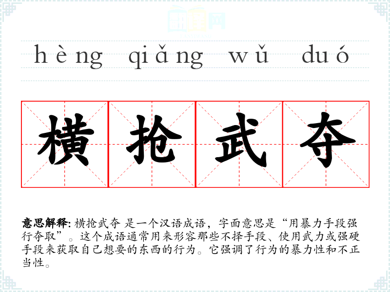 横抢武夺 是一个汉语成语,字面意思是“用暴力手段强行夺取”。这个成语通常用来形容那些不择手段、使用武力或强硬手段来获取自己想要的东西的行为。它强调了行为的暴力性和不正当性。