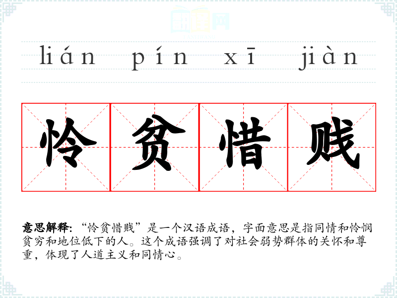 “怜贫惜贱”是一个汉语成语,字面意思是指同情和怜悯贫穷和地位低下的人。这个成语强调了对社会弱势群体的关怀和尊重,体现了人道主义和同情心。