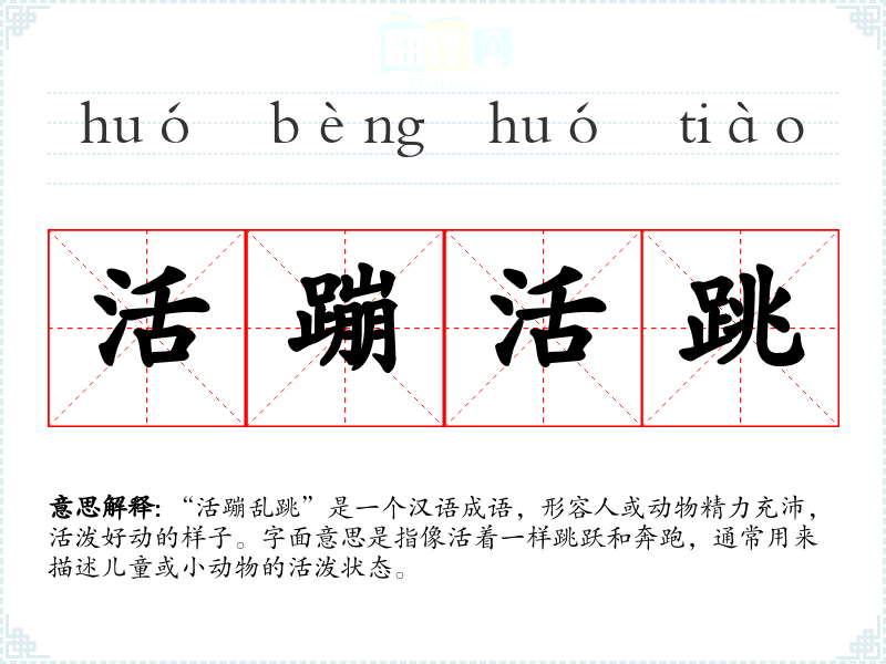 “活蹦乱跳”是一个汉语成语,形容人或动物精力充沛,活泼好动的样子。字面意思是指像活着一样跳跃和奔跑,通常用来描述儿童或小动物的活泼状态。