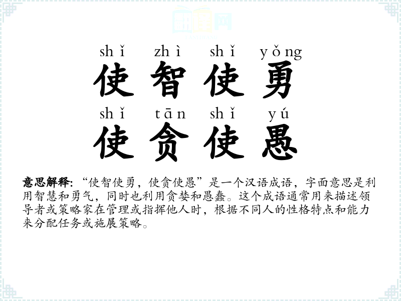 “使智使勇,使贪使愚”这个成语深刻地揭示了管理和领导中的策略性和灵活性。在我个人的语言学*和表达中,它提醒我在面对复杂情况时,需要灵活运用策略,洞察人性,以达到最佳效果。