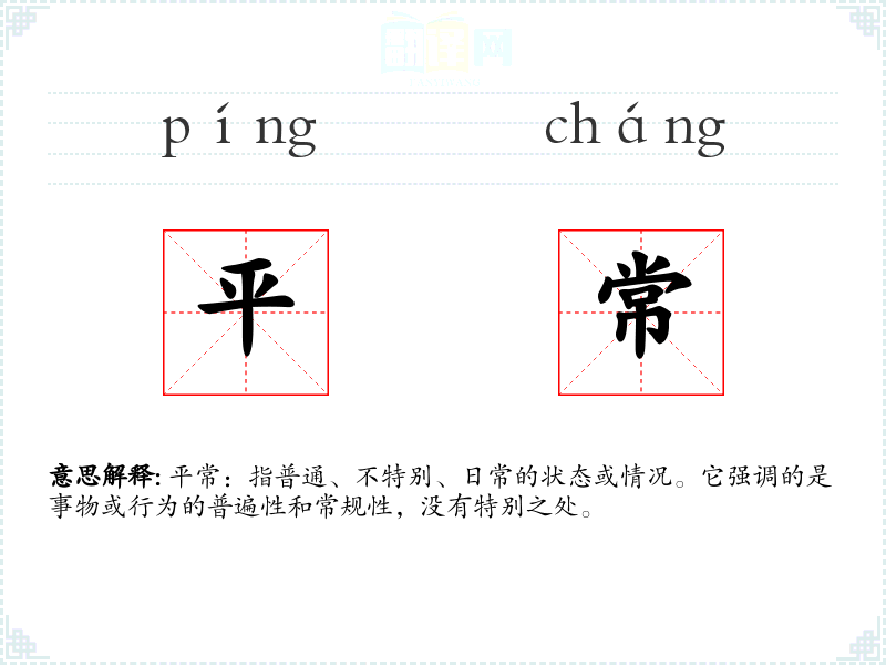 “平常”一词由“平”和“常”两个字组成,“平”指平稳、不波动,“常”指经常、常规。在古代汉语中,“平常”已有使用,如《左传》中有“平常之事”的说法,现代汉语中沿用了这一用法。