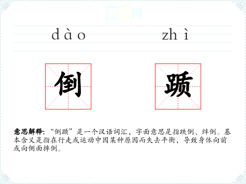 “倒踬”是一个汉语词汇,字面意思是指跌倒、绊倒。基本含义是指在行走或**中因某种原因而失去平衡,导致身体向前或向侧面摔倒。