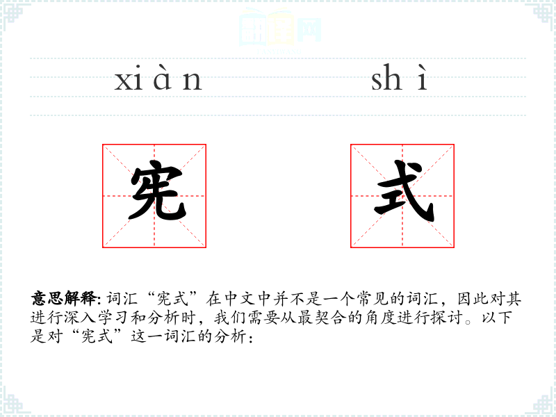 词汇“宪式”在中文中并不是一个常见的词汇,因此对其进行深入学习和分析时,我们需要从最契合的角度进行探讨。以下是对“宪式”这一词汇的分析: