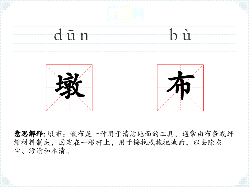 墩布:墩布是一种用于清洁地面的工具,通常由布条或纤维材料制成,固定在一根杆上,用于擦拭或拖把地面,以去除灰尘、污渍和水渍。