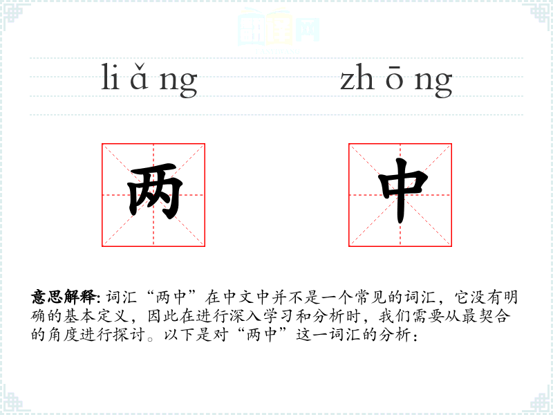 由于“两中”不是一个标准的词汇,它没有明确的字面意思和基本含义。它可能是某个特定领域或方言中的术语,或者是某个特定语境下的临时组合词。
