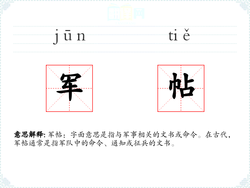 - 反义词:无(军帖作为特定历史时期的军事文书,没有直接的反义词)