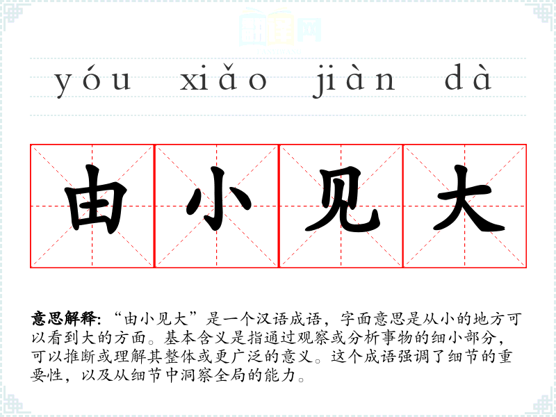“由小见大”这个成语的词源较为模糊,但它体现了汉语中对细节与整体关系的一种哲学思考。随着时间的推移,这个成语在现代汉语中的使用频率逐渐增加,尤其是在教育和商业领域。