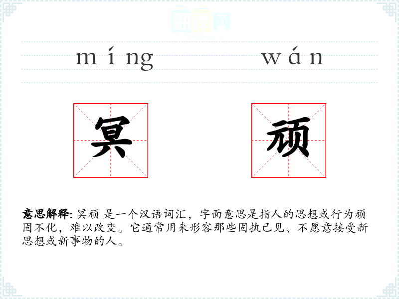 冥顽 是一个汉语词汇,字面意思是指人的思想或行为顽固不化,难以改变。它通常用来形容那些固执己见、不愿意接受新思想或新事物的人。
