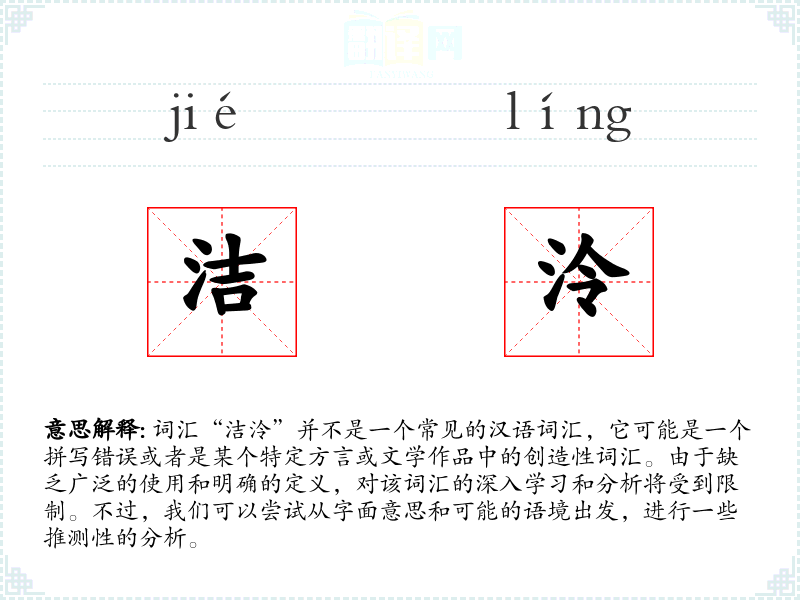 词汇“洁泠”并不是一个常见的汉语词汇,它可能是一个拼写错误或者是某个特定方言或文学作品中的创造性词汇。由于缺乏广泛的使用和明确的定义,对该词汇的深入学习和分析将受到限制。不过,我们可以尝试从字面意思和可能的语境出发,进行一些推测性的分析。