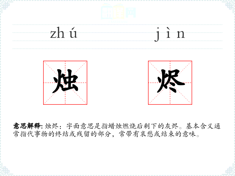- 反义词:新生、起始、繁荣。这些词汇与“烛烬”形成对比,代表开始和活力。