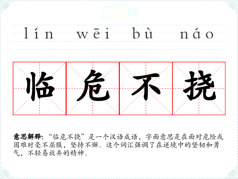 “临危不挠”是一个汉语成语,字面意思是在面对危险或困难时毫不屈服,坚持不懈。这个词汇强调了在逆境中的坚韧和勇气,不轻易放弃的精神。