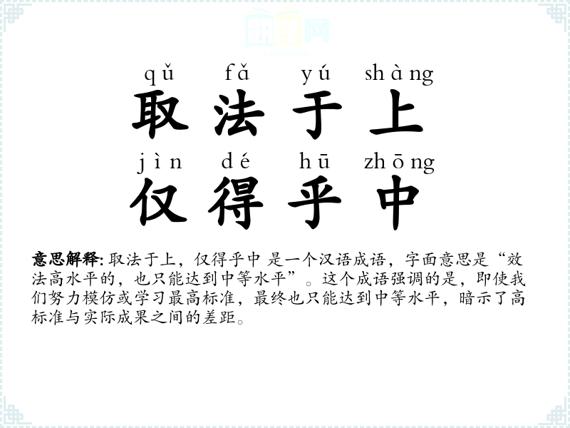 取法于上,仅得乎中 是一个汉语成语,字面意思是“效法高水平的,也只能达到中等水平”。这个成语强调的是,即使我们努力模仿或学*最高标准,最终也只能达到中等水平,暗示了高标准与实际成果之间的差距。