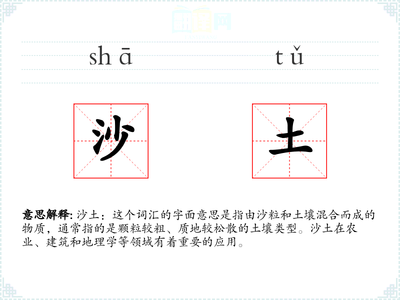 沙土:这个词汇的字面意思是指由沙粒和土壤混合而成的物质,通常指的是颗粒较粗、质地较松散的土壤类型。沙土在农业、建筑和地理学等领域有着重要的应用。