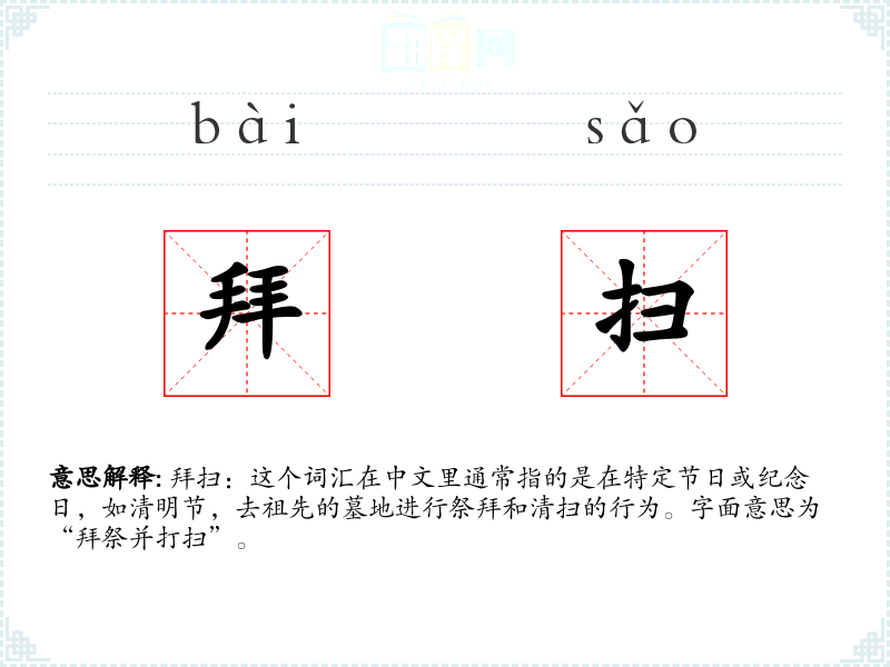 拜扫:这个词汇在中文里通常指的是在特定节日或纪念日,如清明节,去祖先的墓地进行祭拜和清扫的行为。字面意思为“拜祭并打扫”。