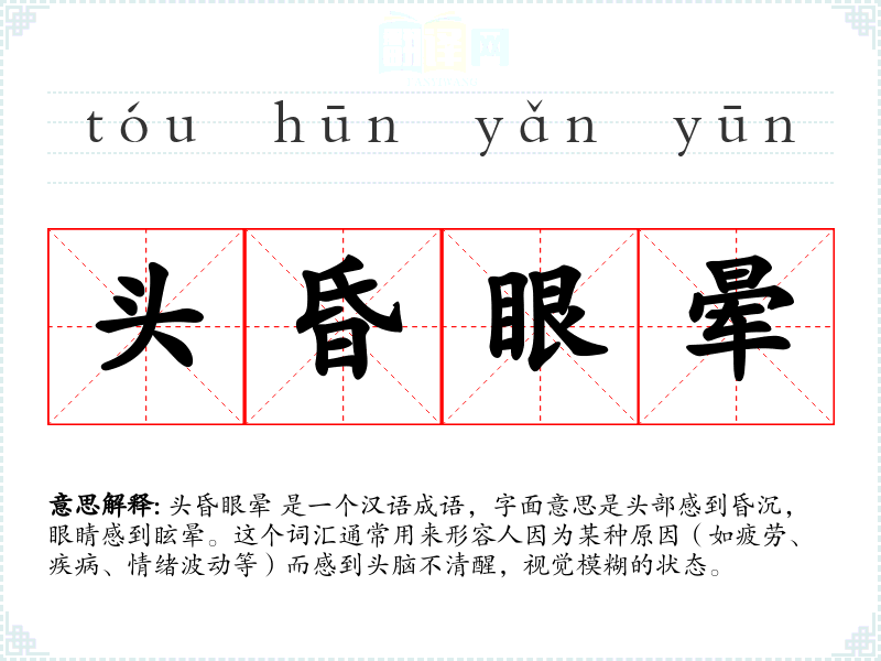 头昏眼晕 是一个汉语成语,字面意思是头部感到昏沉,眼睛感到眩晕。这个词汇通常用来形容人因为某种原因(如疲劳、疾病、情绪波动等)而感到头脑不清醒,视觉模糊的状态。