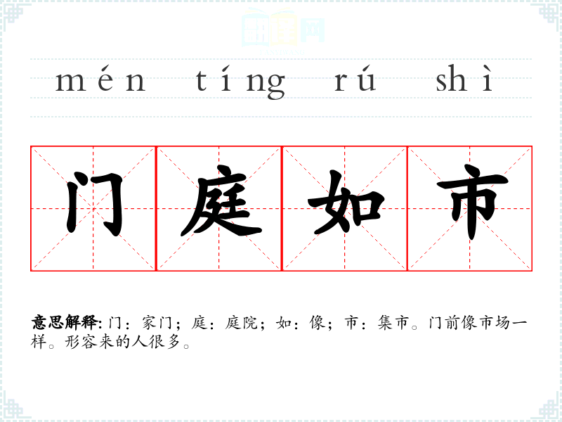 门:家门;庭:庭院;如:像;市:集市。门前像市场一样。形容来的人很多。