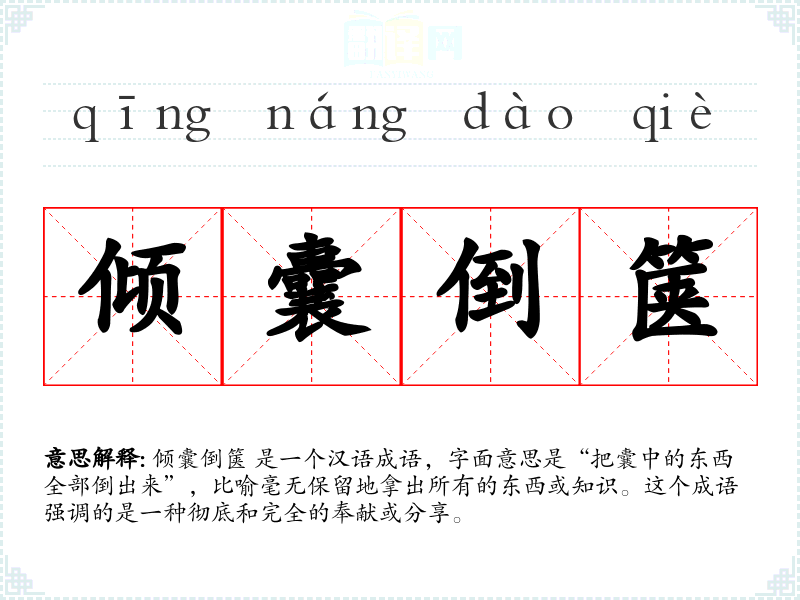倾囊倒箧 是一个汉语成语,字面意思是“把囊中的东西全部倒出来”,比喻毫无保留地拿出所有的东西或知识。这个成语强调的是一种彻底和完全的奉献或分享。