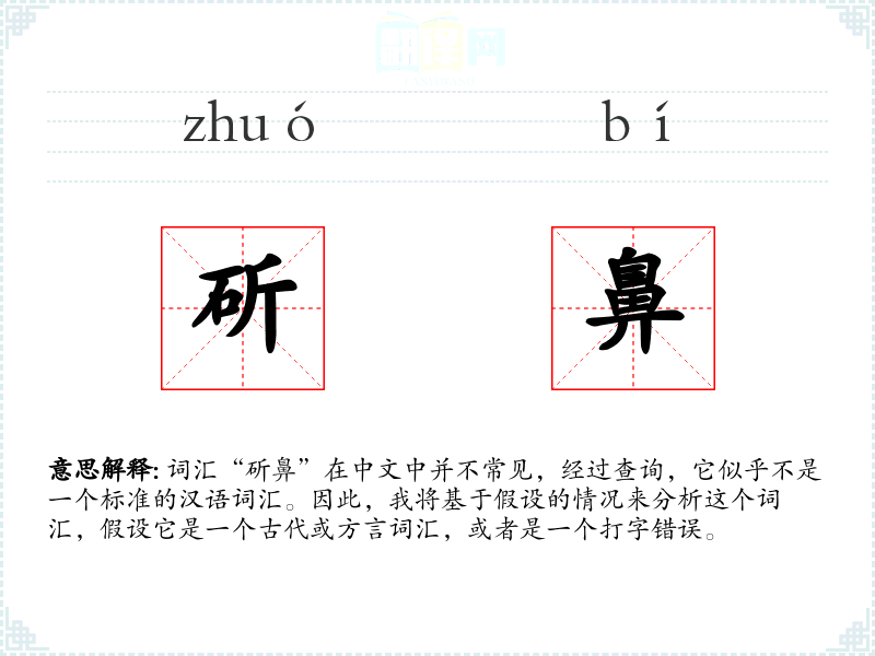 词汇“斫鼻”在中文中并不常见,经过查询,它似乎不是一个标准的汉语词汇。因此,我将基于假设的情况来分析这个词汇,假设它是一个古代或方言词汇,或者是一个打字错误。