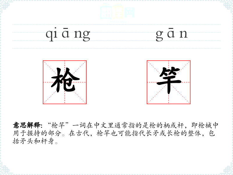 “枪竿”一词在中文里通常指的是枪的柄或杆,即枪械中用于握持的部分。在古代,枪竿也可能指代长矛或长枪的整体,包括矛头和杆身。