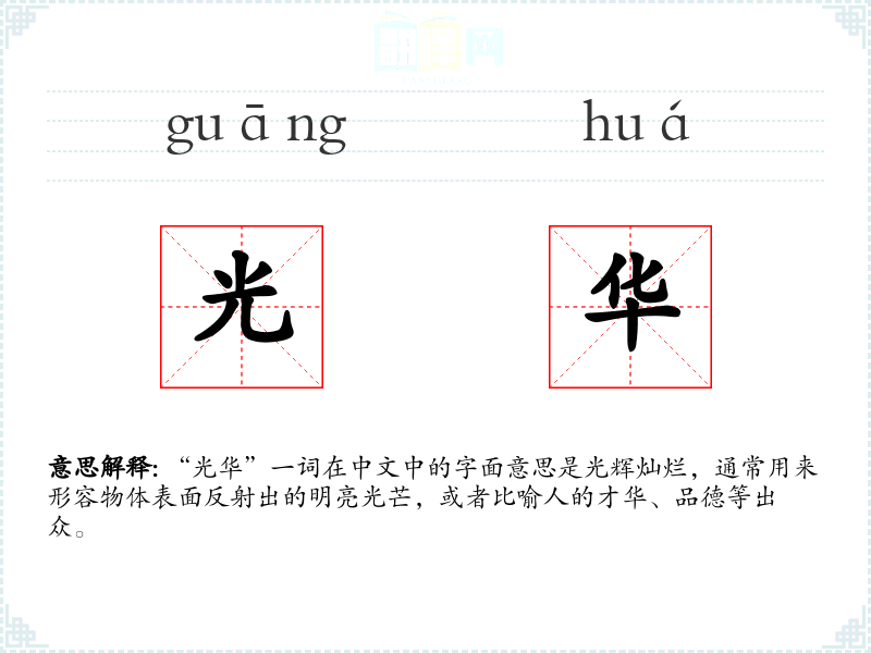 “光华”一词在中文中的字面意思是光辉灿烂,通常用来形容物体表面反射出的明亮光芒,或者比喻人的才华、品德等出众。