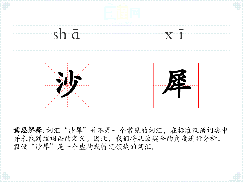 由于“沙犀”不是一个标准词汇,我们可以推测它可能是由“沙”和“犀”两个字组合而成的复合词。字面意思可能是指“沙地上的犀牛”或“类似犀牛的沙地生物”。