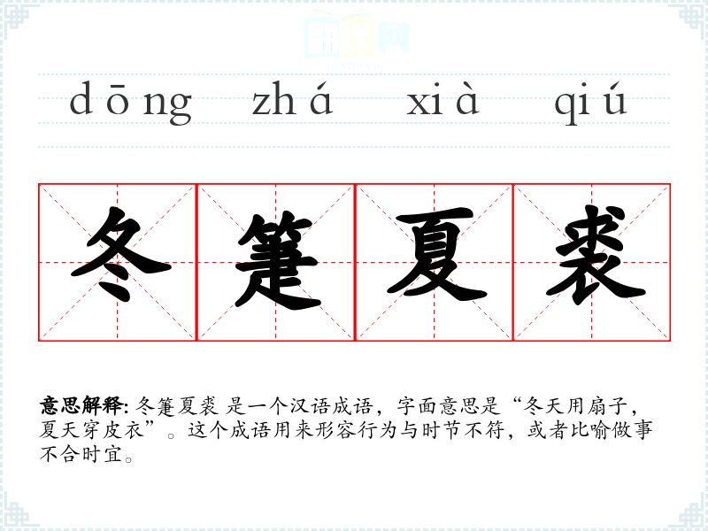 冬箑夏裘 是一个汉语成语,字面意思是“冬天用扇子,夏天穿皮衣”。这个成语用来形容行为与时节不符,或者比喻做事不合时宜。