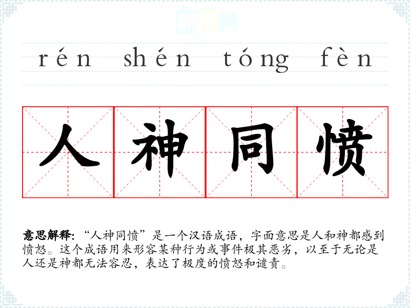 “人神同愤”这个成语的词源较为模糊,但它反映了古代**人对神灵的敬畏以及对道德和正义的重视。随着时间的推移,这个成语的使用逐渐固定下来,成为表达极端愤怒和谴责的常用语。