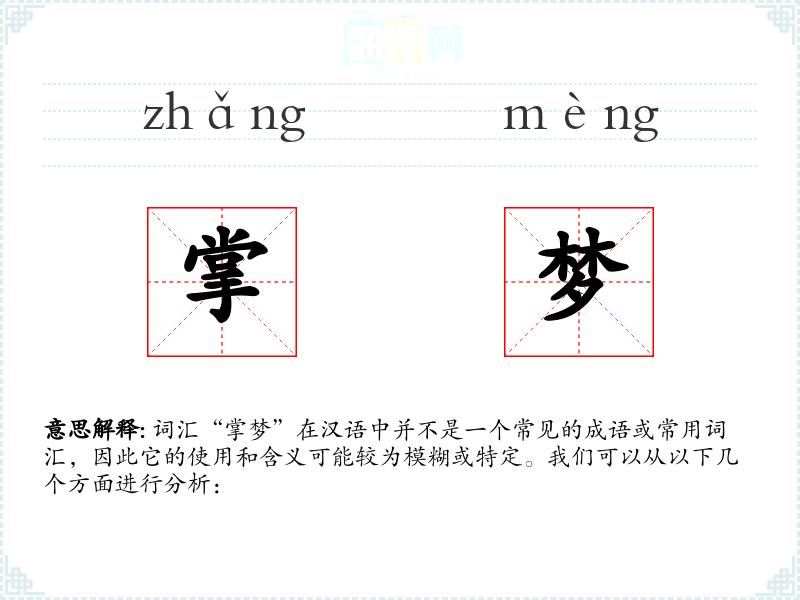 词汇“掌梦”在汉语中并不是一个常见的成语或常用词汇,因此它的使用和含义可能较为模糊或特定。我们可以从以下几个方面进行分析: