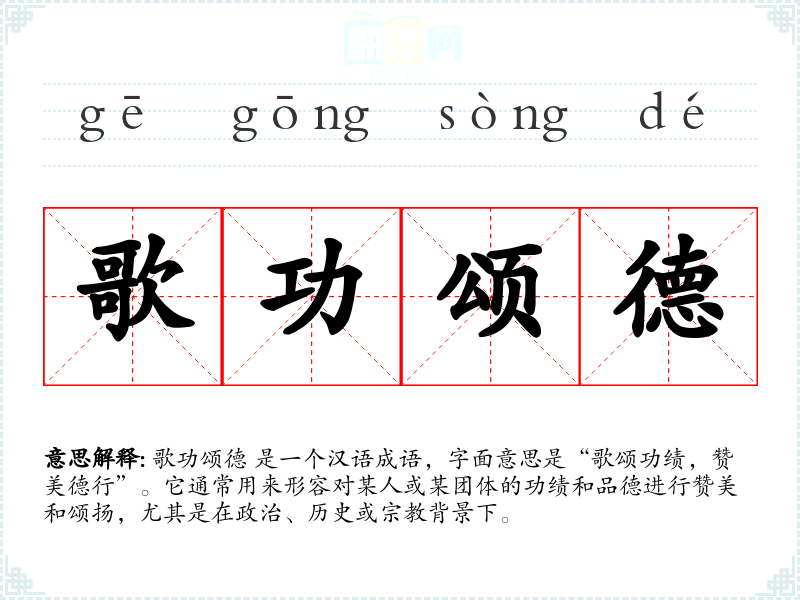 在文化中,歌功颂德** 与尊重和纪念历史人物的传统紧密相关。在社会背景中,这个词汇可能被用于政治宣传或公众教育,以强化某些价值观或历史观念。