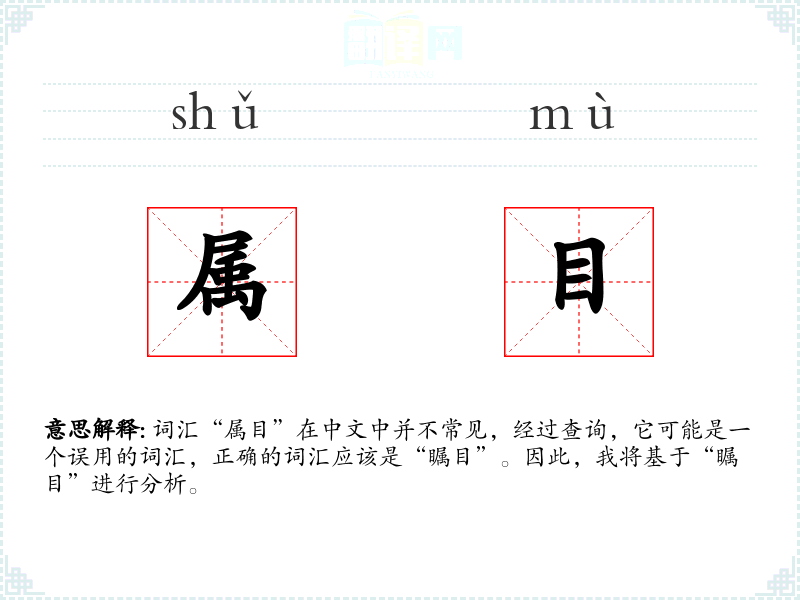 词汇“属目”在中文中并不常见,经过查询,它可能是一个误用的词汇,正确的词汇应该是“瞩目”。因此,我将基于“瞩目”进行分析。