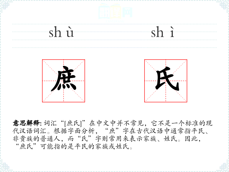 词汇“[庶氏]”在中文中并不常见,它不是一个标准的现代汉语词汇。根据字面分析,“庶”字在古代汉语中通常指平民、非贵族的普通人,而“氏”字则常用来表示家族、姓氏。因此,“庶氏”可能指的是平民的家族或姓氏。