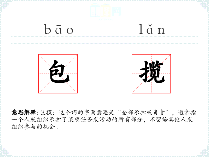 包揽:这个词的字面意思是“全部承担或负责”,通常指一个人或组织承担了某项任务或活动的所有部分,不留给其他人或组织参与的机会。