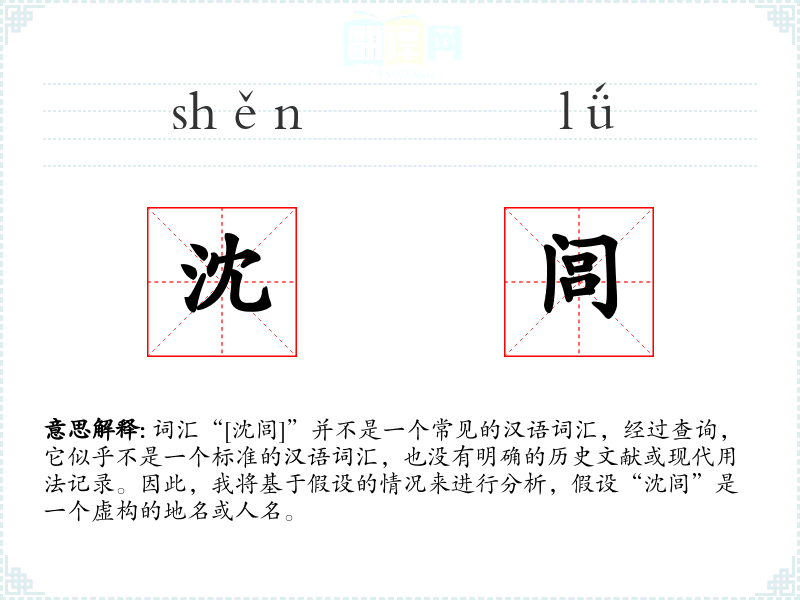 词汇“[沈闾]”并不是一个常见的汉语词汇,经过查询,它似乎不是一个标准的汉语词汇,也没有明确的历史文献或现代用法记录。因此,我将基于假设的情况来进行分析,假设“沈闾”是一个虚构的地名或人名。