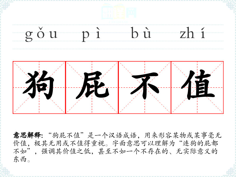 “狗屁不值”是一个汉语成语,用来形容某物或某事毫无价值,极其无用或不值得重视。字面意思可以理解为“连狗的屁都不如”,强调其价值之低,甚至不如一个不存在的、无实际意义的东西。