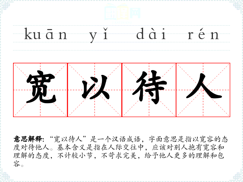 “宽以待人”是一个汉语成语,字面意思是指以宽容的态度对待他人。基本含义是指在人际交往中,应该对别人抱有宽容和理解的态度,不计较小节,不苛求完美,给予他人更多的理解和包容。