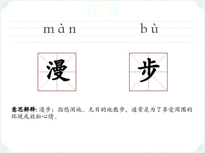 - 口语:在日常对话中,“漫步”常用来表示轻松的散步,如“周末我喜欢在公园漫步。”