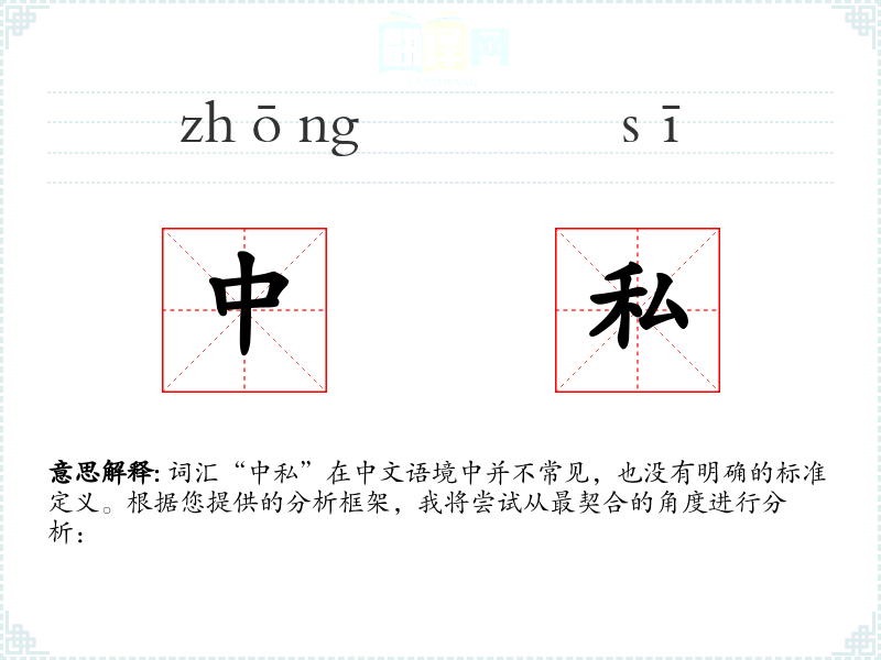 由于“中私”不是一个标准的中文词汇,我们无法给出一个确切的字面意思和基本含义。它可能是某个特定领域或方言中的词汇,或者是某个特定社群中的术语。