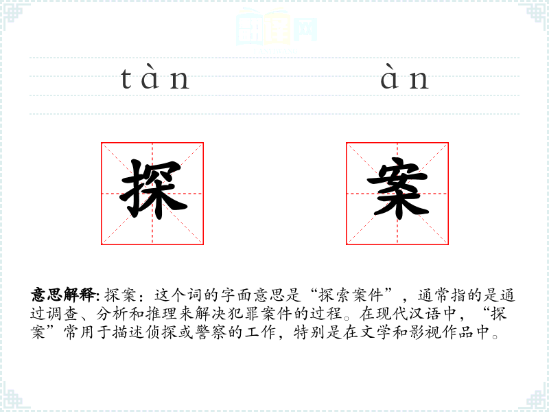 探案:这个词的字面意思是“探索案件”,通常指的是通过调查、分析和推理来解决犯罪案件的过程。在现代汉语中,“探案”常用于描述侦探或警察的工作,特别是在文学和影视作品中。