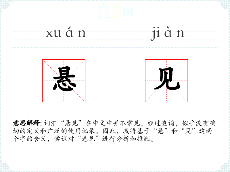 结合这两个字,“悬见”可能指的是一种未决的、不确定的观点或见解,或者是指在某种不确定状态下所见的事物。