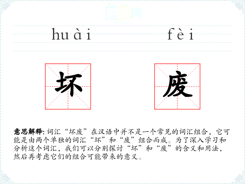 词汇“坏废”在汉语中并不是一个常见的词汇组合,它可能是由两个单独的词汇“坏”和“废”组合而成。为了深入学习和分析这个词汇,我们可以分别探讨“坏”和“废”的含义和用法,然后再考虑它们的组合可能带来的意义。