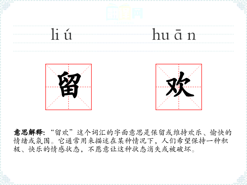 “留欢”这个词汇的字面意思是保留或维持欢乐、愉快的情绪或氛围。它通常用来描述在某种情况下,人们希望保持一种积极、快乐的情感状态,不愿意让这种状态消失或被破坏。