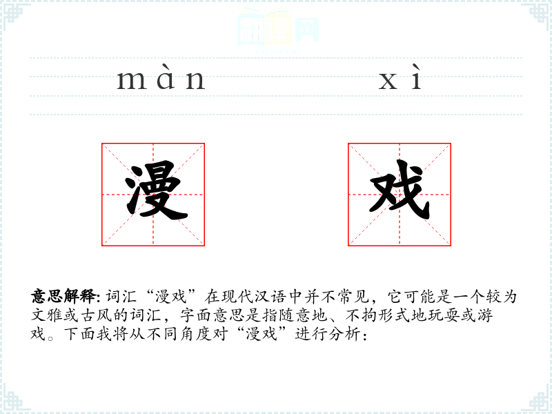 词汇“漫戏”在现代汉语中并不常见,它可能是一个较为文雅或古风的词汇,字面意思是指随意地、不拘形式地玩耍或游戏。下面我将从不同角度对“漫戏”进行分析: