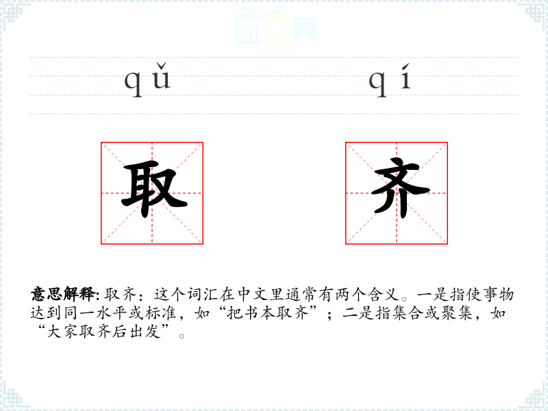 取齐:这个词汇在中文里通常有两个含义。一是指使事物达到同一水平或标准,如“把书本取齐”;二是指集合或聚集,如“大家取齐后出发”。