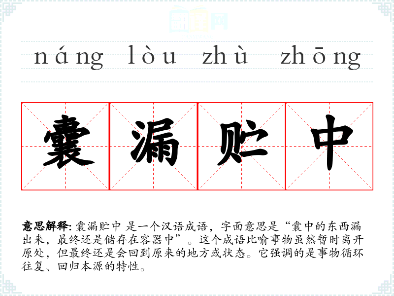 囊漏贮中 是一个汉语成语,字面意思是“囊中的东西漏出来,最终还是储存在容器中”。这个成语比喻事物虽然暂时离开原处,但最终还是会回到原来的地方或状态。它强调的是事物循环往复、回归本源的特性。