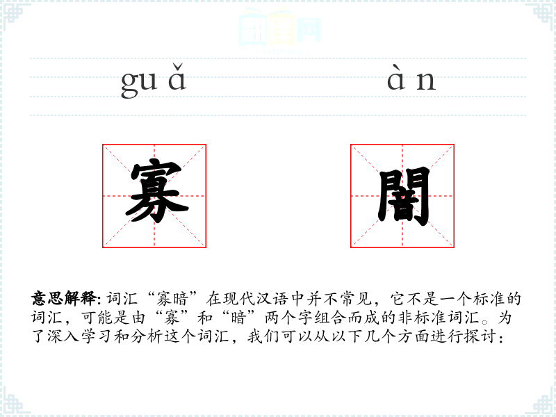 词汇“寡暗”在现代汉语中并不常见,它不是一个标准的词汇,可能是由“寡”和“暗”两个字组合而成的非标准词汇。为了深入学习和分析这个词汇,我们可以从以下几个方面进行探讨: