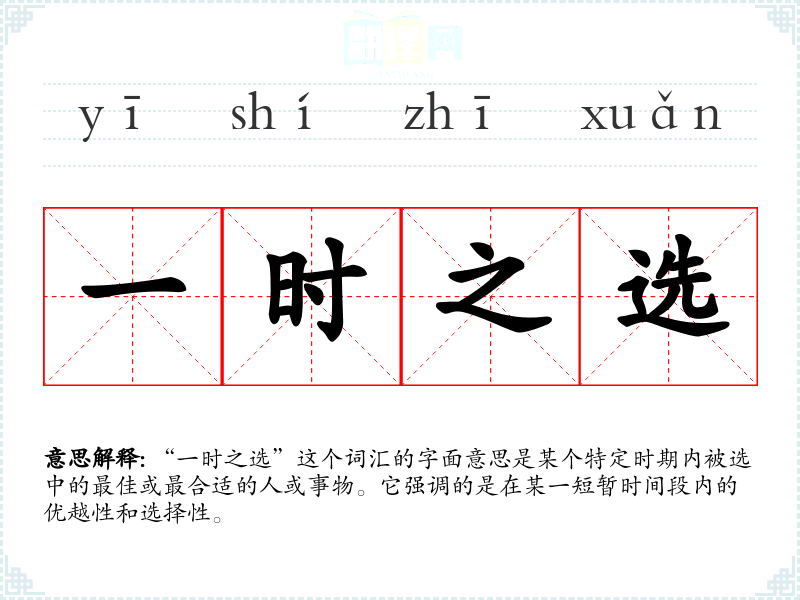 “一时之选”这个词汇的字面意思是某个特定时期内被选中的最佳或最合适的人或事物。它强调的是在某一短暂时间段内的优越性和选择性。