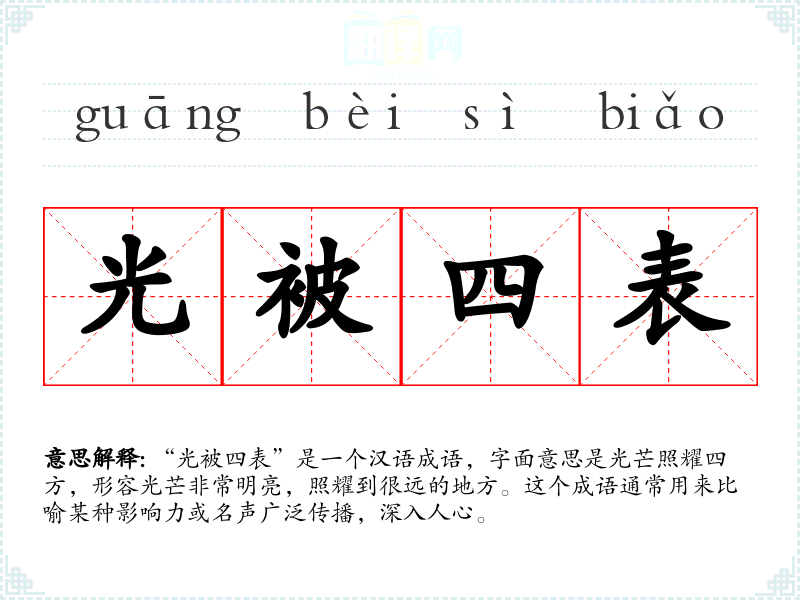 “光被四表”出自《尚书·大禹谟》:“光被四表,格于上下。”原意是指光芒照耀四方,后来引申为形容名声或影响力广泛传播。