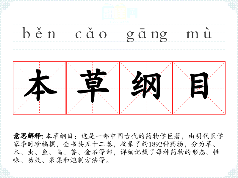 "本草纲目"的意思解释、本草纲目是什么意思由翻译网汉语词典查词提供。