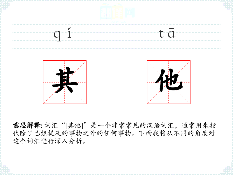 - 反义词:无(因为“[其他]”本身就是一个包含性的词汇,没有直接的反义词)