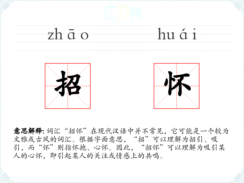 “招怀”的字面意思和基本含义是吸引某人的心怀,引起某人的情感共鸣或关注。